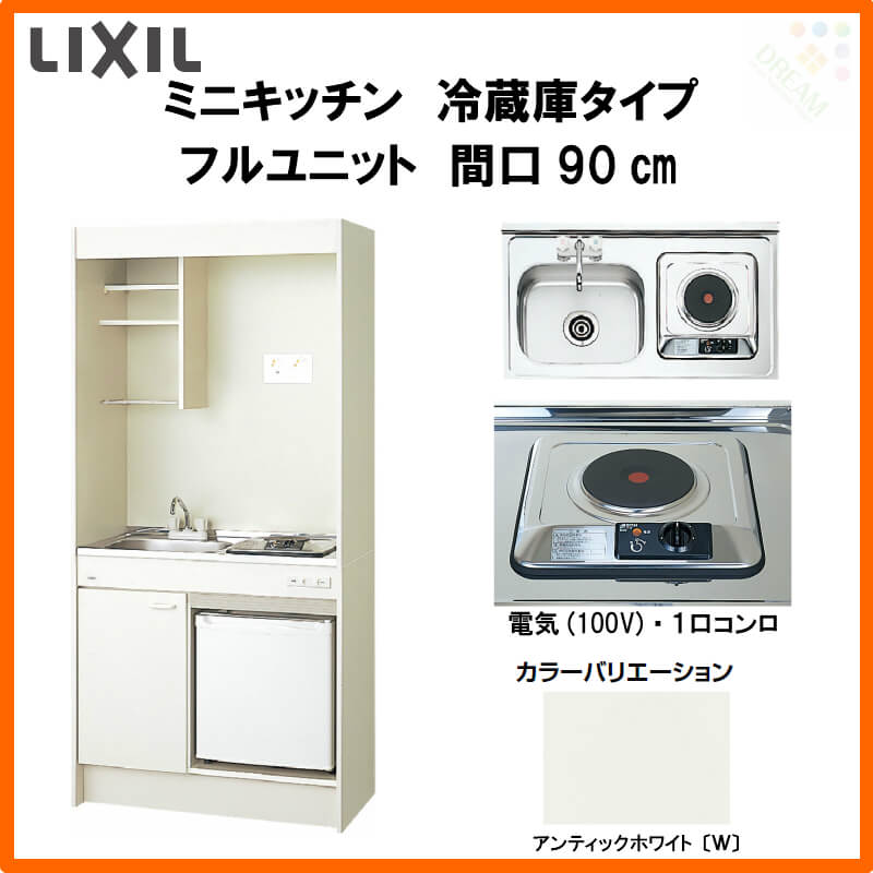 LIXIL/リクシル コンパクト ミニキッチン フルユニット 冷蔵庫タイプ(冷蔵庫付) 間口900mm 電気コンロ100V DMK09LFWB(1/2)A100(R/L)