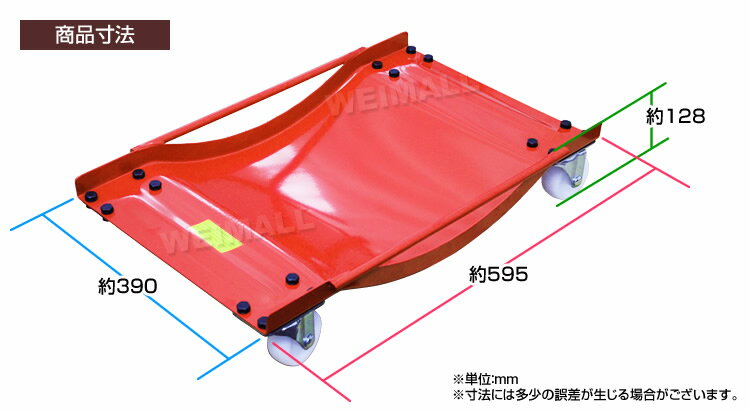 商品仕様 耐荷重:900kg(2個) タイヤ幅:350mmまで対応 サイズ:W595mm×L390mm×H128mm 重量: 20kg(2個) カラー:レッド 使用方法 ジャッキ等で車輌を持ち上げて、タイヤをドーリーに乗せて使用します。